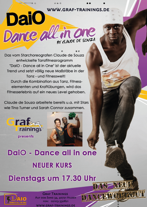 das neue ultimative Danceworkout entwickelt von Starchoreograf Claude de Souza. Daio ist eine Symbiose aus Tanz und Fitness in einer bisher noch nicht dagewesenen Form. Es spricht Einsteiger wie Fortgeschrittene, Kids, Teens und Junggebliebene mit Spaß an Tanz und Fitness gleichermaßen an.